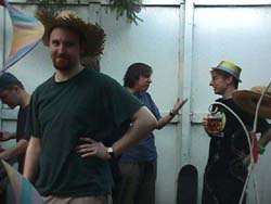 Robert Pitman sporting the castaway look, with Badger and Pete in animated discussion in the background.