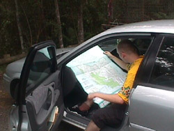 Matty wearing the mandatory Hawaiian shirt and trying to work out how to get to our next destination.